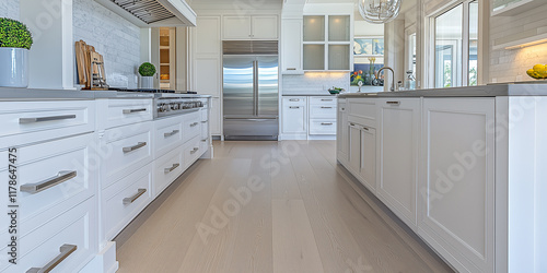 Fototapeta premium Luxuriöse Küche, weiße Eiche, weiße und graue Farben, mattes und erdiges...