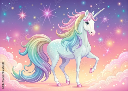 © Arethaawykoff, Naklejka premium Luxuriant, vector design of an imaginative unicorn setting, complete with a pastel rainbow-colored mane, set against a soft, gradient pink sky dotted with sparkling stars and a hypnotic