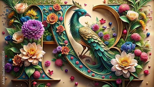© Supittra, Fototapeta premium Luxurious Alphabet Set Featuring Elegant Letters Adorned with Floral Arrangements and Peacock Feathers, Perfect for Stylish Text and Writing Designs