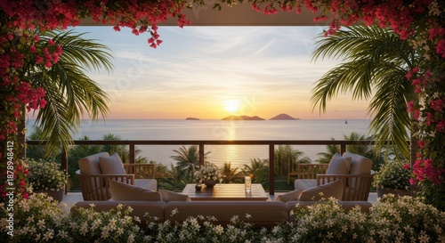Fototapeta premium Luxurious balcony overlooks tropical ocean view during golden hour sunset
