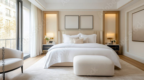 Fototapeta premium Luxurious bedroom with plush bed, elegant decor, and natural light