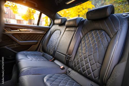 © Daria, Obraz premium Luxurious black leather car backseat with diamond quilted pattern