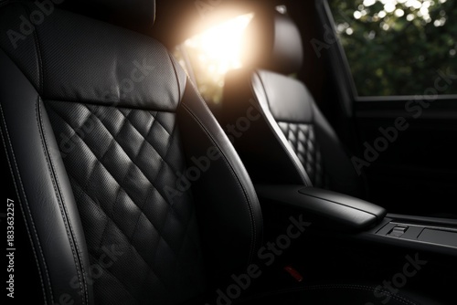 © Narongsag, Fototapeta premium Luxurious black leather car seats display intricate diamond quilting and bright sunlight streaming through the window