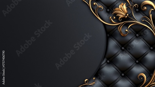 © Asgar, Obraz premium Luxurious Black Leather Quilted Texture with Golden Floral Ornament Frame.
