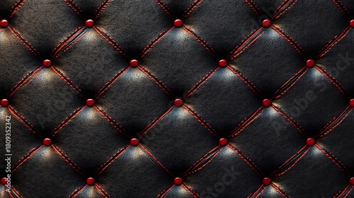 © Peerawat, Obraz premium Luxurious Black Leather Upholstery with Red Accent Stitching in Diamond Pattern for Elegant Interior Design