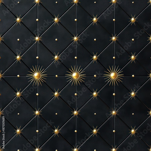 Fototapeta premium luxurious black quilted leather panel with gold studs and radiant sunburst ornaments in a symmetrical diamond grid evoking elegant opulence