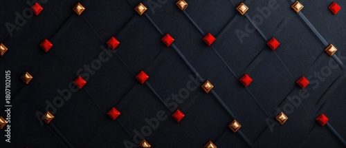© FoxGrafy, Obraz premium Luxurious Black Quilted Upholstery with Gold and Red Diamond Studs