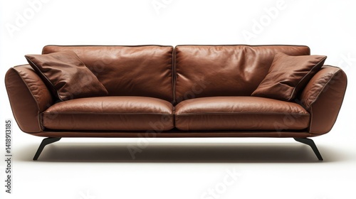 © Arwin, Fototapeta premium Luxurious brown leather sofa with pillows isolated against white background
