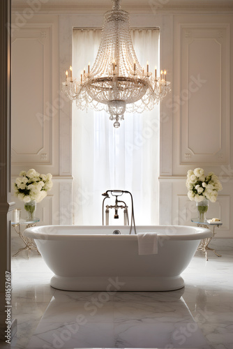 © Ethel, Fototapeta premium Luxurious Bubble Bath in Elegant and Sophisticated Bathroom Interior Design with Grand Chandelier