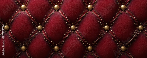 © Fat Bee, Obraz premium Luxurious burgundy tufted leather background with a diamond pattern and gold button accents