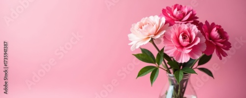 Naklejka premium Luxurious carnations in vase, pink backdrop Mother's Day greeting concept , romantic, spring, greetingcard