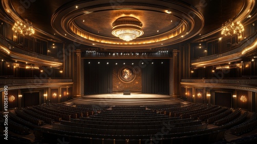 © Paul, Obraz premium Luxurious circular theater with plush seating encircling a central rotating stage, elegant chandeliers illuminating the performers in a grand spectacle