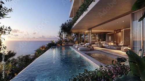 © loxia stock image, Fototapeta premium Luxurious cliffside infinity pool overlooking the ocean. Tranquil, modern, and spacious living area seamlessly integrated with outdoor space