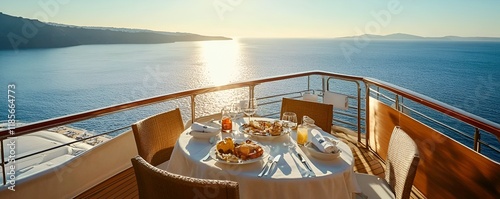 © Malik, Fototapeta premium Luxurious Cruise Ship Breakfast Facing Sunlit Santorini