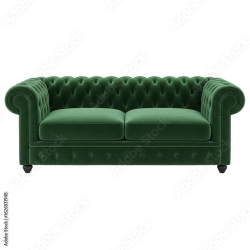 © Emam, Fototapeta premium Luxurious deep emerald green velvet chesterfield sofa with button tufting and rolled arms isolated on transparent background