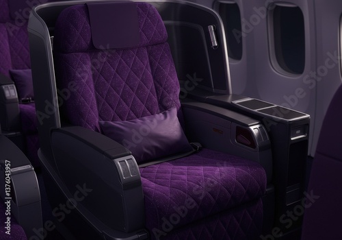 © Tortuga, Naklejka premium Luxurious deep purple business class airplane seat with chrome accents for ultimate comfort