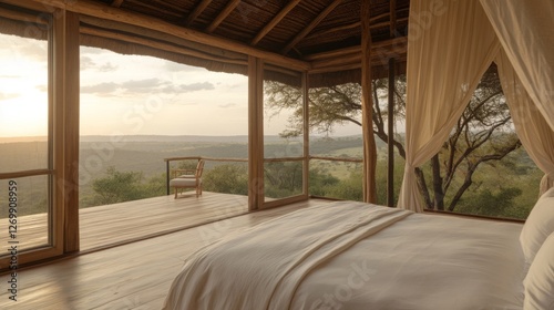 © musa, Fototapeta premium Luxurious Elevated Bedroom with Panoramic Sunrise View