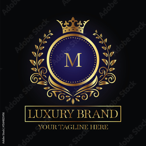 Fototapeta premium Luxurious Emblem Design with Gold Letter M and Crown on Black Background