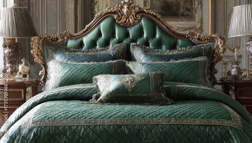 © musthofa, Obraz premium Luxurious emerald green bedding set adorned with intricate gold embroidery on a lavishly detailed antique bed.