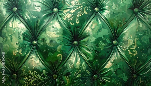 Obraz premium Luxurious Emerald Green Tufted Upholstery with Ornate Swirl Patterns.