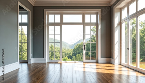 Obraz premium Luxurious Empty Room with Hardwood Floors and Mountain View Through Large...