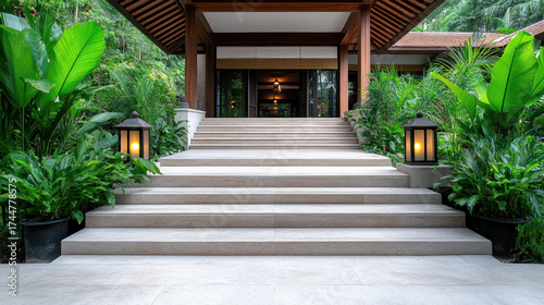Fototapeta premium Luxurious entrance with stone steps, surrounded by lush greenery and elegant lanterns