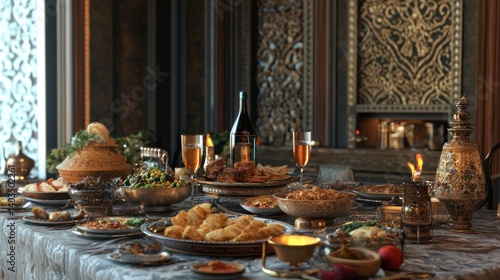 © Waqiah, Fototapeta premium Luxurious feast in ornate dining room