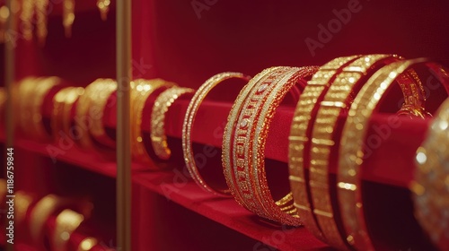 Obraz premium Luxurious golden bangles and necklaces displayed on a red velvet background,...