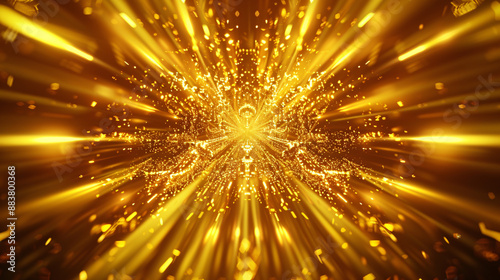 Obraz premium Luxurious golden glowing background with symmetrical crystal shapes and light rays
