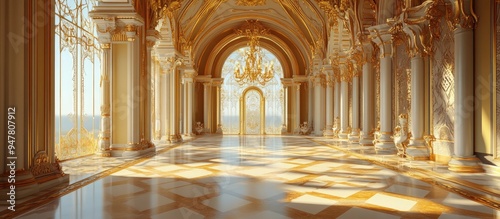 © ArtificialHorizons, Fototapeta premium Luxurious golden interior of a palace in a 3D rendering