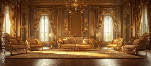 Fototapeta premium Luxurious golden living room with ornate furniture, sunlight streaming through large windows, elegant decor