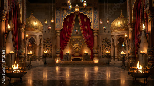 Fototapeta premium Luxurious Golden Royal Throne Room Interior for stage background theater