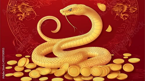 © zhou yan, Obraz premium Luxurious golden snake coiled around gold ingots, symbolizing wealth, prosperity, and good fortune. Intricate vector illustration with traditional Chinese patterns and 3D elements on a vibrant red bac