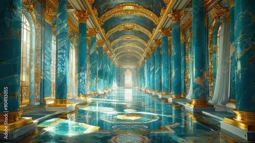 Obraz premium Luxurious Grand Hall with Ornate Golden and Blue Marble Columns and Intricate...