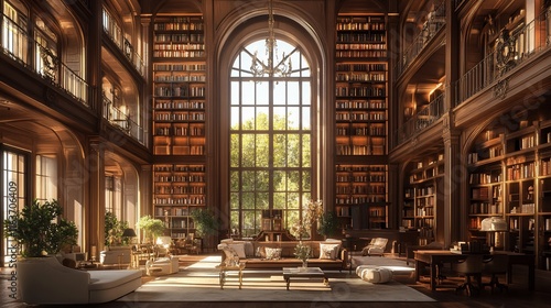 Fototapeta premium Luxurious, grand library with tall arched windows, filled with bookshelves, comfortable seating, and elegant d?cor.