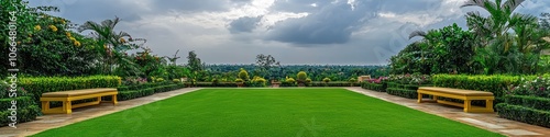 © Tahir, Naklejka premium Luxurious green backyard with pale yellow benches under a cloudy sky.