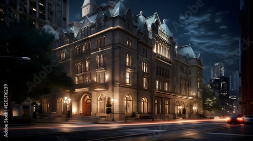 © ChrisTYCat, Naklejka premium Luxurious Highrise Hotel Situated in the Heart of a Bustling Downtown Cityscape Offering Upscale Accommodations Exquisite Amenities and a Premium Hospitality Experience