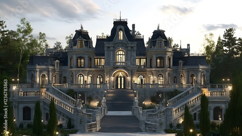 © wacharagorn, Obraz premium Luxurious Historic Mansion Surrounded by Lush Greenery at Dusk