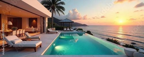 © Buri, Fototapeta premium Luxurious holiday villa with private pool and stunning ocean views Perfect for a relaxing getaway or family vacation Enjoy breathtaking sunsets and outdoor living , vacation, swimming