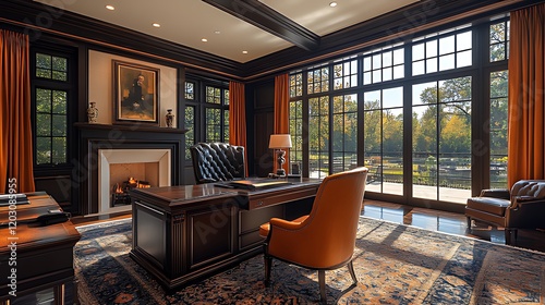 © banyu bening, Naklejka premium Luxurious home office, autumn view, fireplace, design