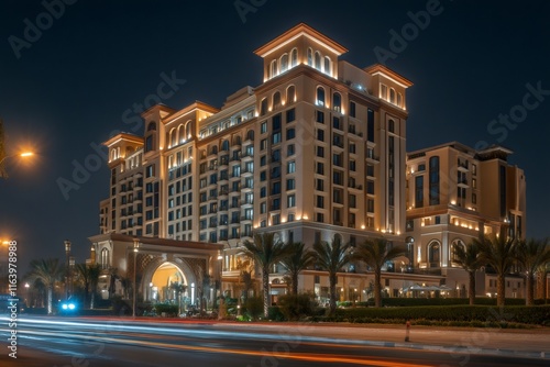 © Gatherina, Fototapeta premium Luxurious hotel building illuminating the night sky with street lights and palm trees