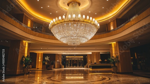 Obraz premium Luxurious hotel lobby featuring a stunning chandelier and elegant decor, creating a warm and inviting atmosphere.