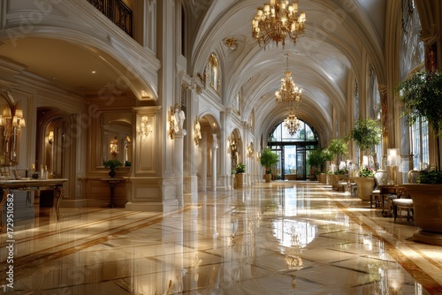 © YouraPechkin, Obraz premium Luxurious Hotel Lobby with Marble Floor and Vaulted Ceiling