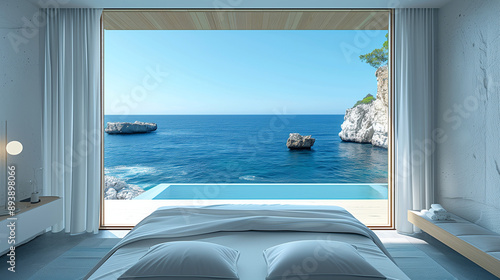 © Alena, Fototapeta premium Luxurious hotel room with a king bed, panoramic ocean views, and bright, airy space, emphasizing supreme comfort and elegance.
