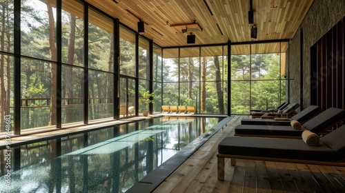 Fototapeta premium Luxurious indoor swimming pool area with large windows overlooking a peaceful forest, exuding elegance and relaxation.