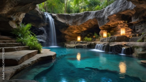© Rahmat, Naklejka premium Luxurious indoor waterfall pool, nestled within a natural cave-like setting. Tranquil, cascading water, stone steps, and lush foliage