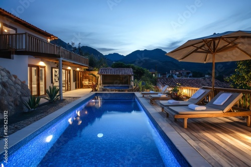 © Lubos Chlubny, Fototapeta premium Luxurious infinity pool overlooking tropical mountains at dusk