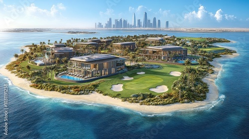 Fototapeta premium Luxurious island resort with golf course and city skyline backdrop.
