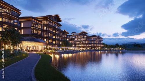 © Jakkarin, Fototapeta premium Luxurious Lakeside Resort with Intricate Design at Sunset