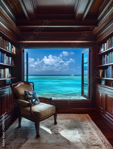 © Richafuji, Naklejka premium Luxurious Library Interior with Ocean View Through Open Window Featuring a Comfortable Armchair and Bookshelves